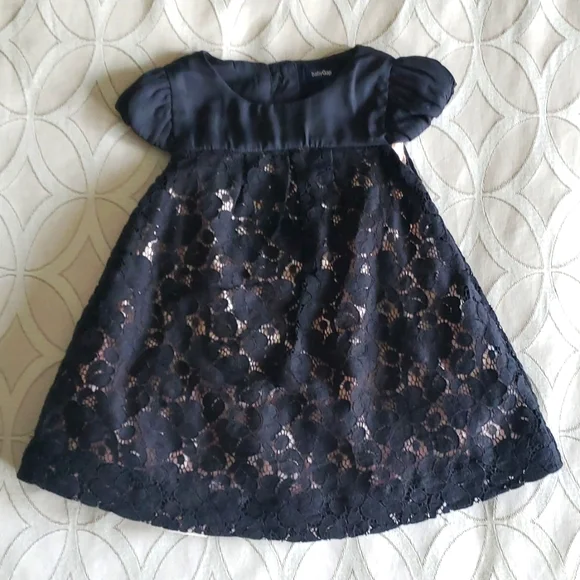 The dress is black lace from the gap. 3-6 months. Never been worn.