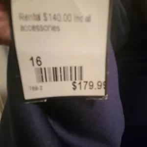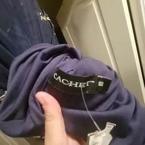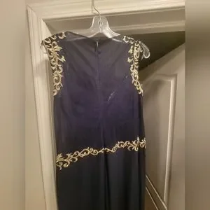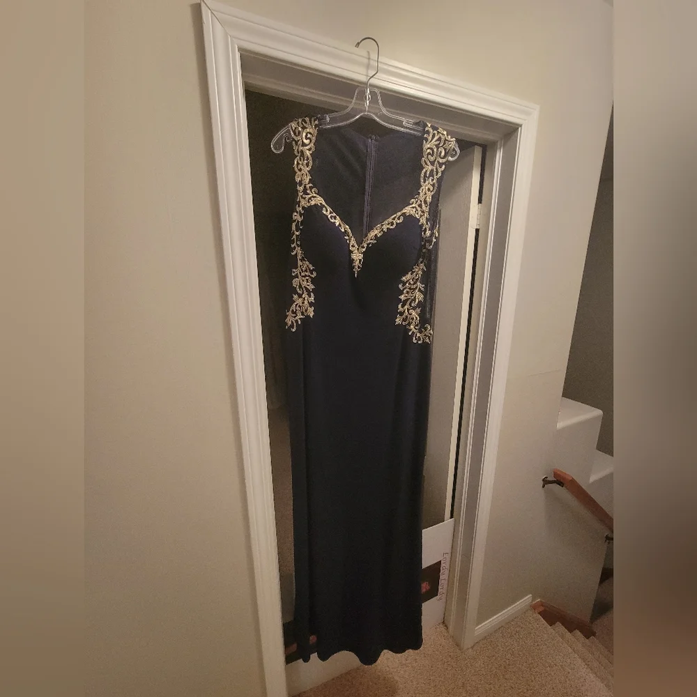 Navy blue floor length gown with antique gold embellishments. Sheer back, built in cups and fully lined. Worn once for a wedding