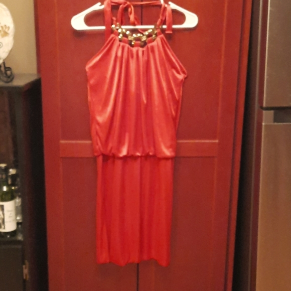 Sleeveless summer dress with a chain neckline. Bronze color. Never worn. Has a small snag not noticeable. Smoke free.