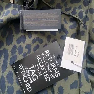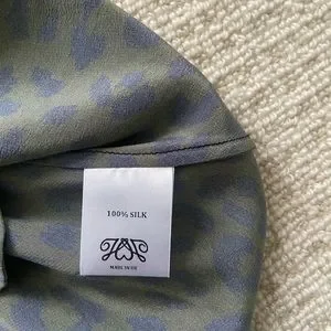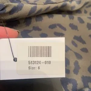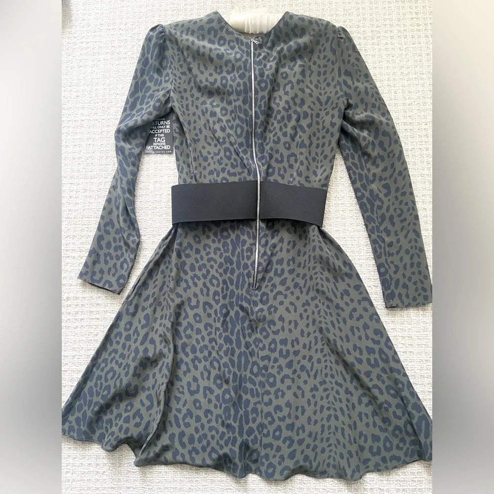 Olive green/black leopard print with elastic attached belt and zipper detail at back. 100% silk. Purchased from Net a Porter