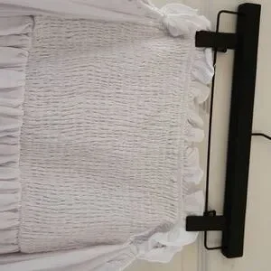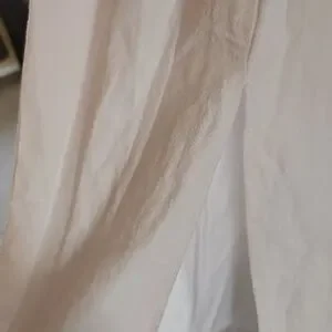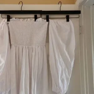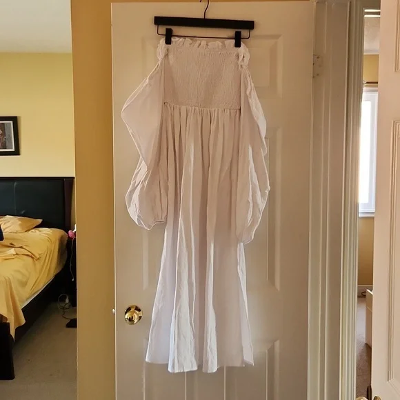 Long, white, sleeved/off-the-shoulder, stretched bodice dress