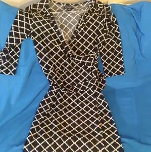 Beechers Brook large size long sleeve dress v-neck black background with white criss cross design and wrap around belt.