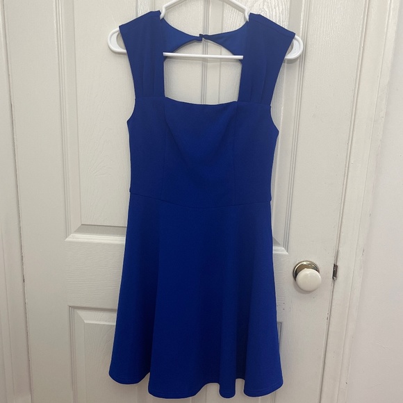 Solid colour blue dress, open back, sleeveless, excellent condition