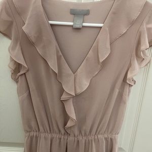 Good condition, ruffle style, doted, chiffon like material (polyester), cap sleeves, v neckline