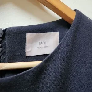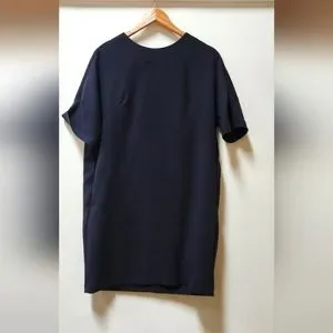 Dark blue dress, with nice pockets on the side. Very simple and versatile, can be dressed up with a scarf or necklace. Really pretty on, meant to look oversize.