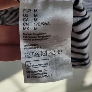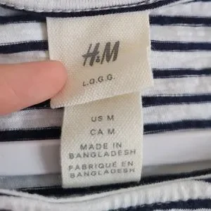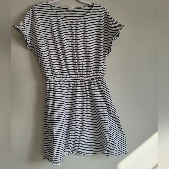 100% cotton, black and white striped, summer dress. Above the knee length with high neckline. Could fit medium or large.