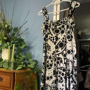 Black/White elegant panel dress . There are 7 panels. Length of Dress is 42 inches from top of shoulder strap to bottom of dress. Circumference is 38 inches around the bust.
