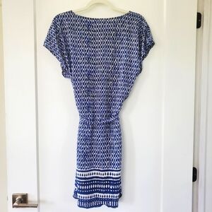 Blue and white summer dress. Ties the waist. Beautiful blockprint pattern.