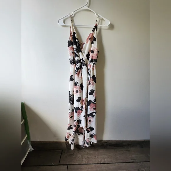 Garage size Xs, but fits a small as well. In very good condition. Very beautiful and elegant flowy dress. Floral print. Slit up the front but not too high. No rips or stains. Clean, Smoke free home.