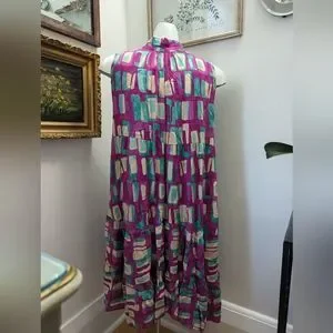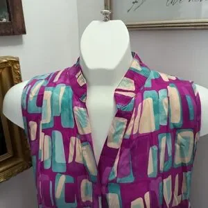 Buttons down the front, provide some options. Wear it alone, or pair it with a fall jacket and gorgeous boots. It's a rich pink, beige and turquoise. The fabric is soft and comfortable. No label but it measures like a medium+.