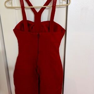 Red strapless dress with beaded detail. Fitted and stretchy. size 3. Le Chateau Brand