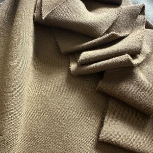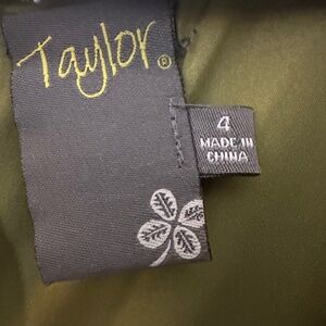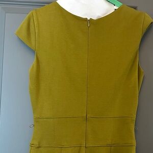 Below the knew dress with belt. Ruffled neck. Zipper back. Pea soup colour.