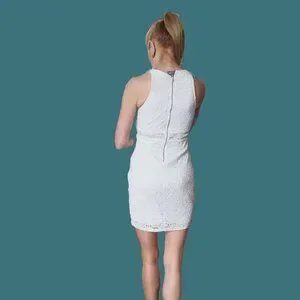 Off white lacy lined dress by Le chateau. Zipper in back. The lace around waistband and neckline is not lined, so you can see your skin slightly. Super fun.