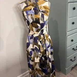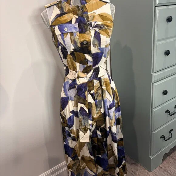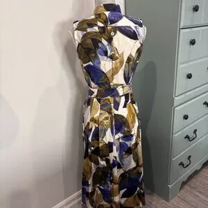 Tropical pattern multi-colour belted dress. Box pleats with front chest pocket detail and hidden slash pockets on side. Front button closure (top to bottom) Fully lined.