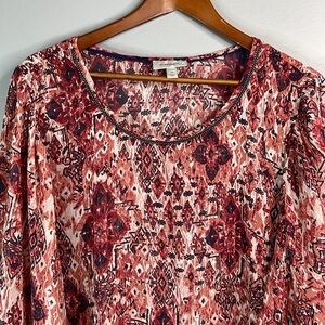 Women’s deep red, dusty rose, white and navy blue Dress Barn Semi Sheer Printed Top.