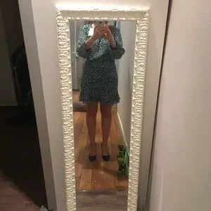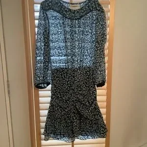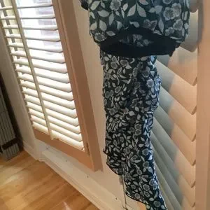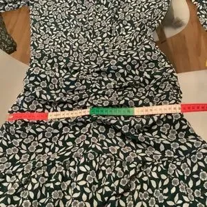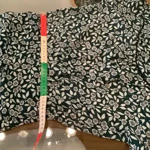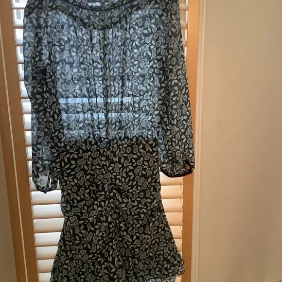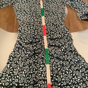 delicate floral print fabric. A mix of blue and light Green. Gathered at the hips.