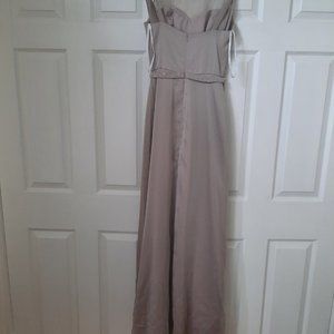 Floor length silk Champaign dress with satin lining. Bra is incorporated in the dress. Bra size B34 -B36. Rain stone accents thin belt. Very simple and elegant dress, a very narrow A stile. Perfect for any occasion, including meeting the Queen. This dress it is a sophisticated and elegant head turner.
