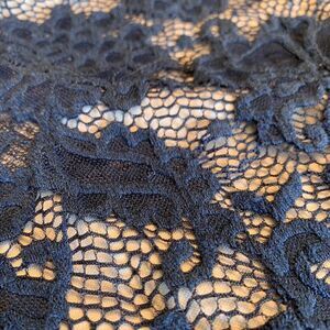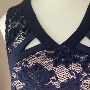 Dress, Guess, all stretch lace, navy over nude, sz 6, knee length, EUC