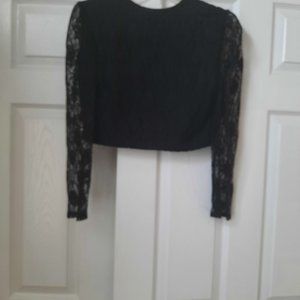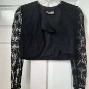 The perfect little black dress. Size 4-6 , bodycon with straps, black silk lace with stretch satin lining. Rain stone enhanced breast curves Length is up to 3/4 . With this dress you would like to get the perfect jacket made out of lace width long lacey sleeves and lined body. Rounded corners and waist long, this will perfectly compliment your dress in any occasion.