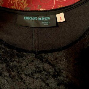This dress is like new. Beautiful black velvet with shimmering under light. Laced; easy to fit. Made in UK. Oval neckline. Perfect for evening, party... Gothic effect. Tight. Very flattering. Swirung Dervish Free (Brand). Strech.