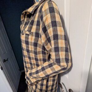 Made with recycled materials. 56% cotton, 42% polyester, and 2% other fibers. Size: medium. Pit: 51 cm. Total length: 88.5 cm. Sleeve length: 58 cm. Buttons on the sleeves. 1 pocket at chest level. In black, beige, and mustard yellow checkered. Zip on the front.