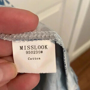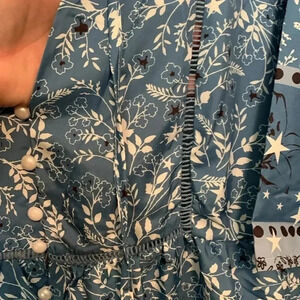 Blue dress with white and black floral pattern. 3/4 sleeves. Nice detail on bodice. Lightweight fabric. Size XL