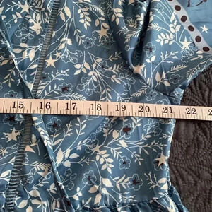 Blue dress with white and black floral pattern. 3/4 sleeves. Nice detail on bodice. Lightweight fabric. Size XL