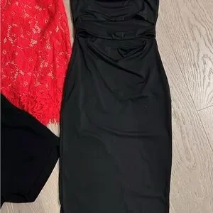 Various dresses - club Monaco romper, city luxe red lace dress, Aritzia black dress and green silk top. All fit a size small!