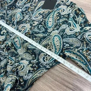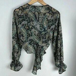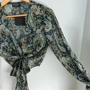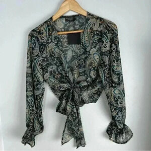 Paisley Front Tie Top features a cropped fit, long sleeves, and front tie closure. This paisley print can easily be dressed up or down from season to season