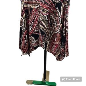 V neckline dress with Shark Bite hem line. 3/4 sleeves.