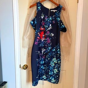 Beautifully done flower dress in scuba fabric with exposed shoulder