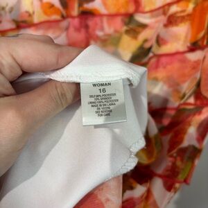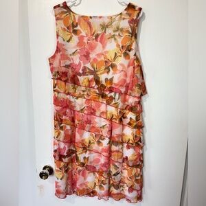 Beautiful sleeveless dress by Dressbarn in a vibrant floral print with warm pink, orange, and green hues. Features layered ruffle detailing and a flattering A-line shape. Size 16. Measurements: PTP 21in | Length 39in. Condition: 9/10.