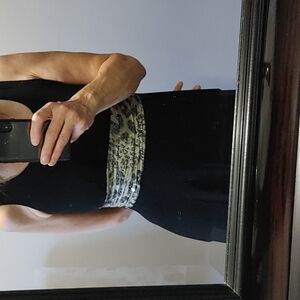Gorgeous flattering dress has gold coloured with black animal print front band and shimmery detailing. Lined bodice and unlined skirt portion. This is a one piece though materials tag says two piece. It is just a dress. Very good used condition. New to poshmark? Sign up with my code Jstewart261 to receive $15 off your first purchase.