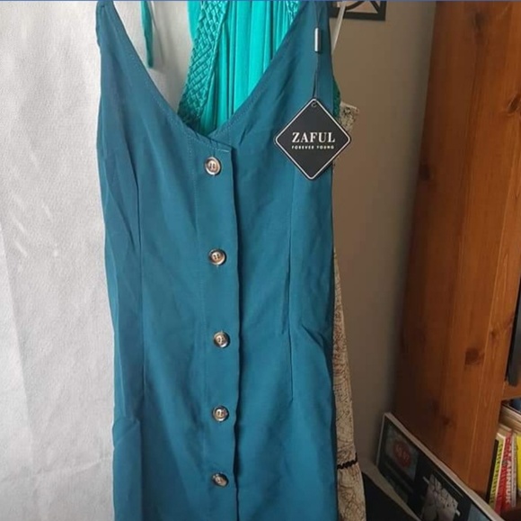Dark real with faux wooden buttons down the front. Cute tie up in the back.