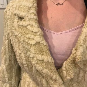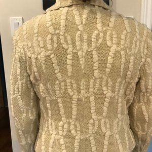 Purchased in Paris to go from work to evening events, this wool blend blazer is a heavy weight and features 2 lapel styles - ruffle & traditional. Single button, it is tapered in the waist and just skims the hips. Wear it like the French - with a shimmery black long pencil skirt and a black sheer bodysuit under the jacket. Dress it up with a big bulky necklace with lots of text and sleek patent leather LV purse and heels - you are set for the evening.