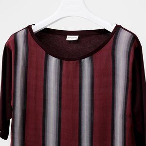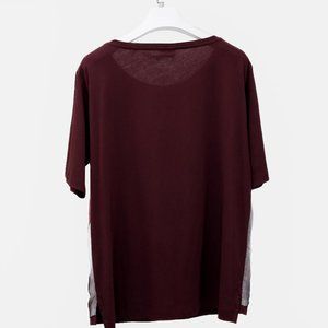 A burgundy round neck tee from Dries Van Noten, featuring a layered silk striped panel at the front and a horizontal hem, split at the sides.