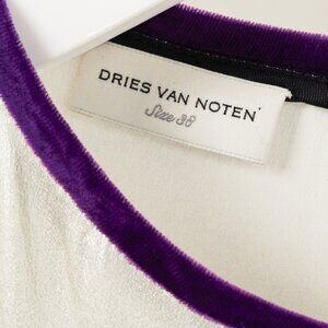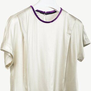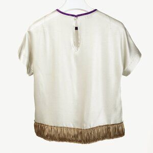 This blouse from Dries Van Noten is crafted in a champagne silk satin, and features short sleeves, shoulder pleats, a crewneck with contrast purple velvet trim, a back hook-closure keyhole, a loose silhouette throughout the bodice, and a gathered metallic gold hem.