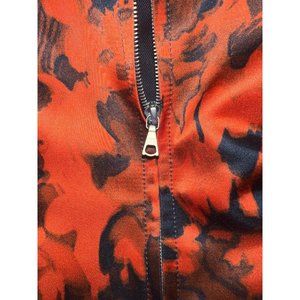 Long sleeve viscose satin jacket with graphic pattern printed in black and tones of red throughout. Spread collar.