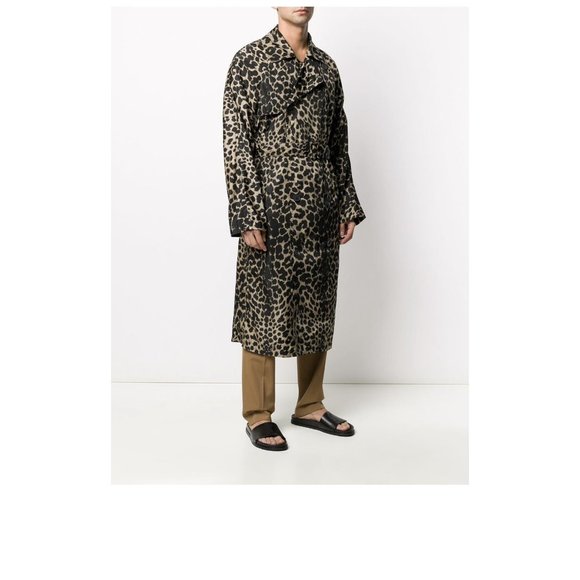 Beige double-breasted leopard coat from Dries Van Noten featuring a leopard print, a wide leg, a double breasted front fastening, a belted waist, side pockets and a mid-length.