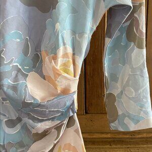 Pastel, flora camo print. Slightly short sleeves above the wrist, with a crew neckline. Ruching detail on left hand side of the body add visual interest. 100 % cotton. Like new, hardly worn.
