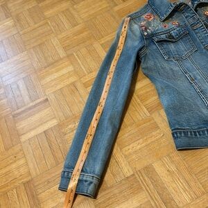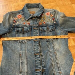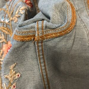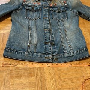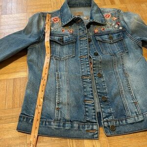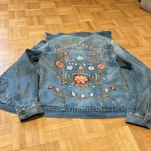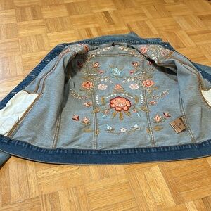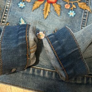 Stylish denim jacket with floral embroidery. Perfect for adding a touch of elegance to your casual look.