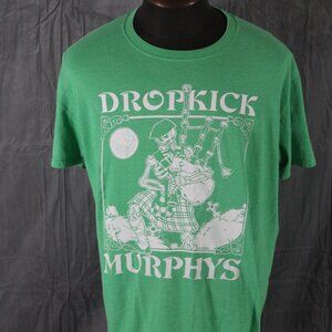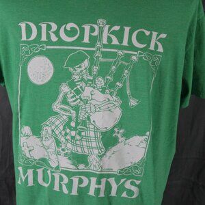 Up for sale is a retro Dropkick Murphys shirt. It has a green base colour with a graphic of a skeleton piper screened on the front in white. The back of the shirt has it's so lonely round the fields of Athenry screened in whtie from shoulder to shoulder. What a great shirt do not miss out on it.