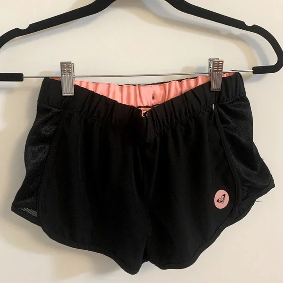 These black Roxy shorts are in amazing condition. No rips or stains. There is an adjustable elastic waist band with a lace that can be tied. The shorts are mostly made of a dry fit black material. However on both sides of the shorts there is a thick black jersey like material. Additionally on the back of the shorts is a velcroed pocket.