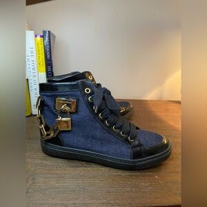 Dsquared2 Denim Sneakers, high top in excellent condition, leather inside, denim top, gold hardware, chain and lock detail. Absolutely gorgeous.