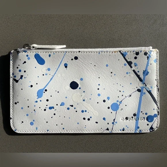White/blue paint splatter vegan leather pouch Great condition - never used Dimensions; 8 x 4.5 inches