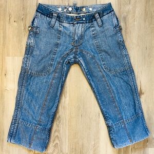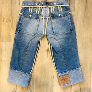 One side is plain denim and the other side has beige seam bindings that along centre, and side seams.