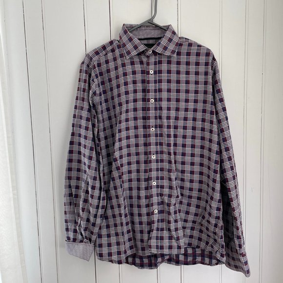 Elevate your wardrobe with this stylish and sophisticated Duchamp London dress shirt. Featuring a tailored fit and a white, red and blue plaid and mini houdstooth pattern woven in Italy. 100% cotton. Made in Portugal. No size tag, best fits M-L.