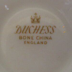 Vintage Duchess bone china teacup and saucer, pink floral pattern.