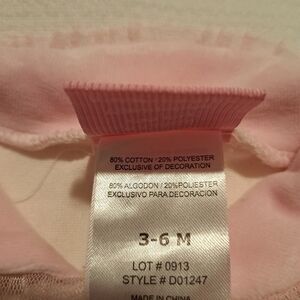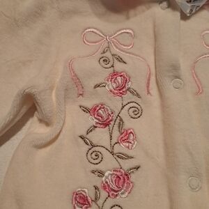 Duck Duck Goose layette girls 3-6 months cream & pink footie with floral embroidery, snap closure, has tulle trim on cuffs and collar