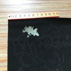 Tri-chem/Artex pre-printed fabric for liquid embroidery painting has a design of a duck pond scene. Black velvet/flocked fabric has a "fuzzy" texture on the front. Fabric is 20" wide x 24" long. A small section along the top has been painted in white as shown.